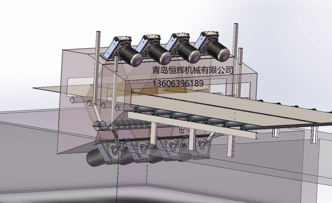抛丸器的布置:采用8台电机直驱抛丸器,抛丸量可达900kg/min,抛丸速度≥82m/s,抛丸器布置经过三维模拟,上下抛丸器一一对应,避免薄板变形,消除型钢死角,一次抛打和二次反弹弹丸避开辊道,弹丸覆盖均匀一致。